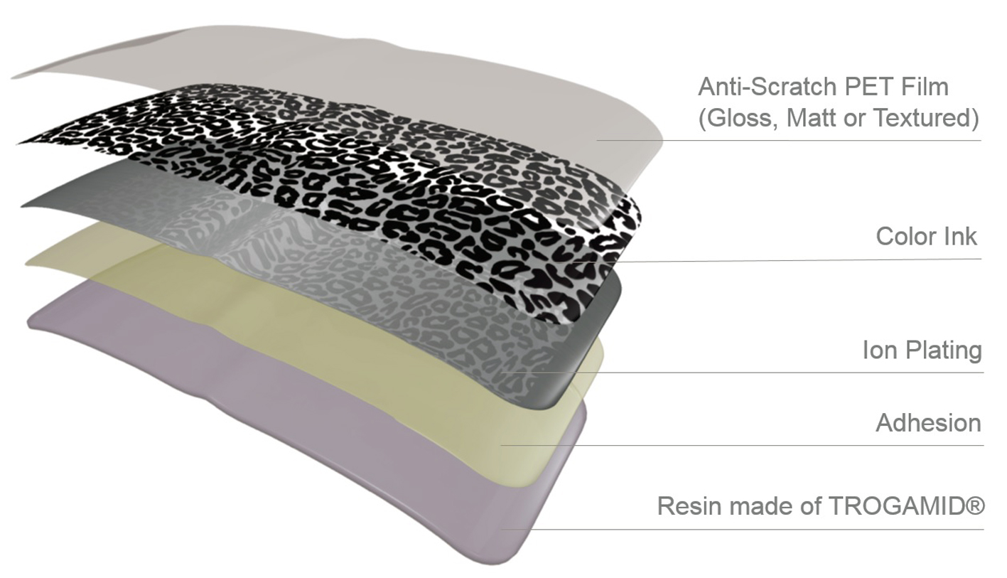Ao contrário dos métodos de produção tradicionais, esta nova tecnologia se baseia no recorte das armações acabadas de uma pré-forma única, curva, otimizando, desse modo, as etapas de usinagem e acabamento após a moldagem por injeção. A pré-forma é fabricada com antecedência a partir de múltiplas camadas funcionais – a base, feita em TROGAMID®, as camadas de adesão e revestimento, ou o filme resistente a arranhões – e pode ser produzida de modo rápido e flexível, permitindo variar tanto o tamanho da pré-forma quanto o seu raio de curvatura.