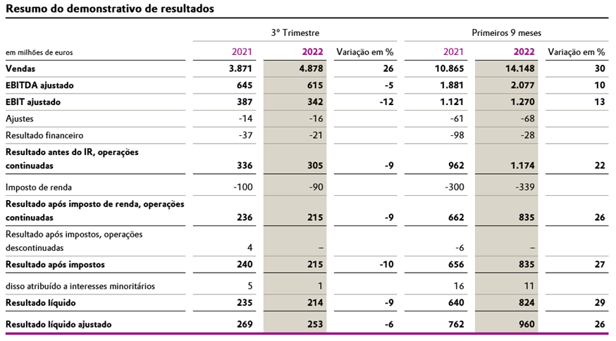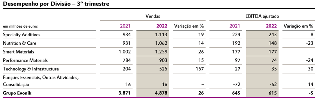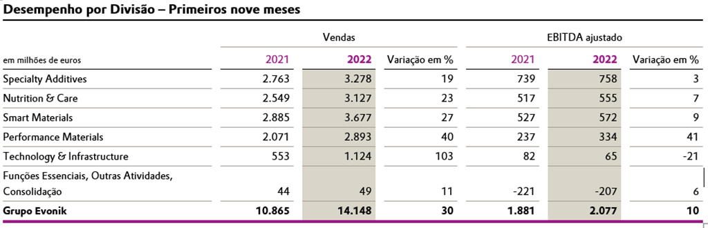 Diante do cenário de uma economia claramente enfraquecida, a Evonik apresentou um desempenho sólido no terceiro trimestre. Embora os volumes de venda tenham sido menores, os resultados foram 26% superiores na comparação ano a ano, fechando em 4,88 bilhões de euros, em razão de aumentos nos preços. Dessa maneira, os aumentos nos custos variáveis puderam ser repassados com sucesso. Os resultados ajustados antes dos juros, impostos, depreciação e amortização (EBITDA ajustado) foram só 5% inferiores, ficando em 615 milhões de euros.