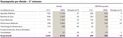 Performance Materials: As vendas da divisão cresceram 47% para 1.043 milhões de euros no segundo trimestre. Preços superiores e efeitos positivos do câmbio contribuíram para isso, apesar da redução dos volumes. Os produtos C4 e o negócio de superabsorventes contabilizaram aumentos significativos nas vendas. O EBITDA ajustado subiu 65% para 163 milhões de euros em resultado de aumentos no preço da nafta e melhoras nas margens dos produtos.