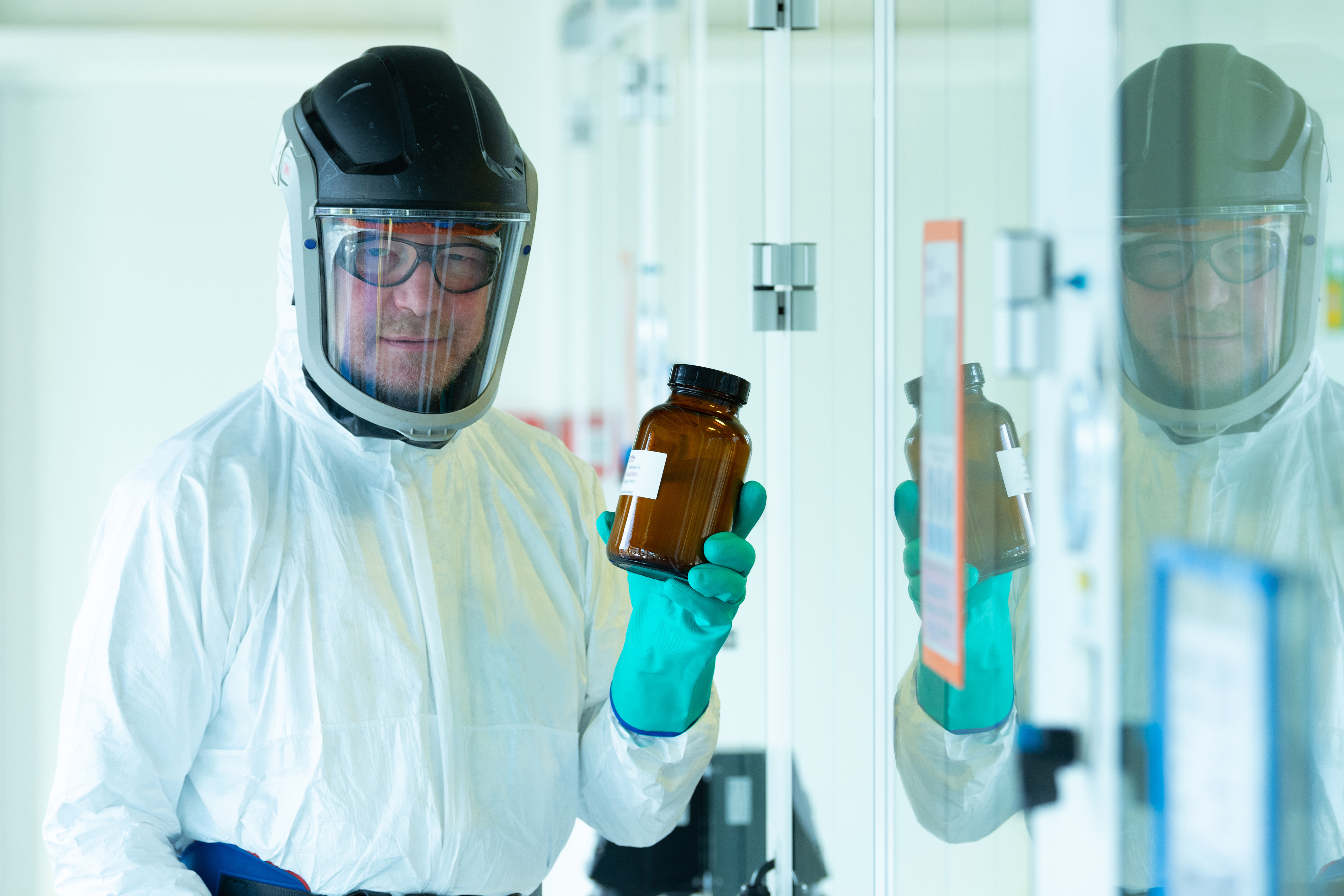 Lipídios para a vacina da BioNTech contra a COVID-19: O químico Mathias Günther com um lote da vacina envasada na unidade de produção de lipídios em Hanau.