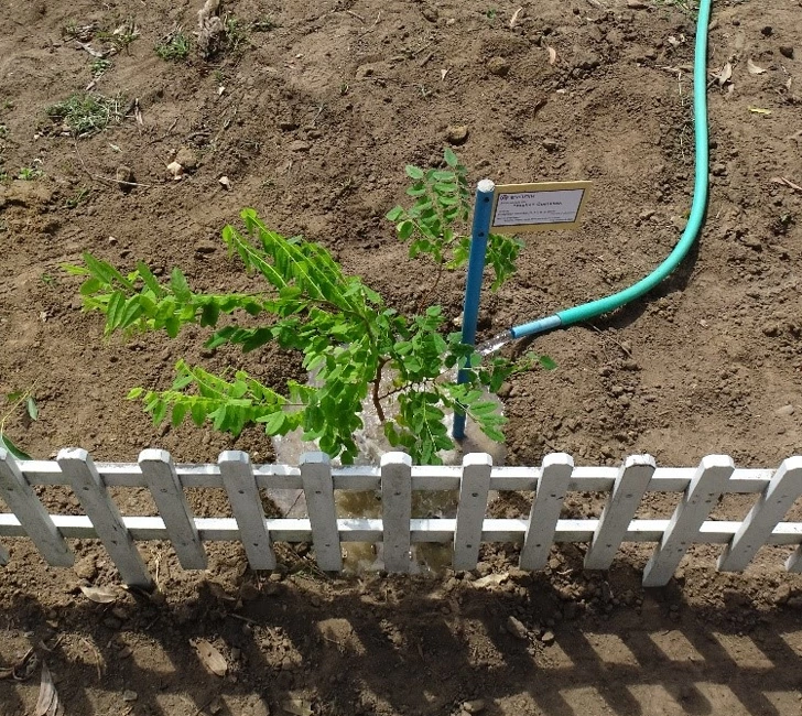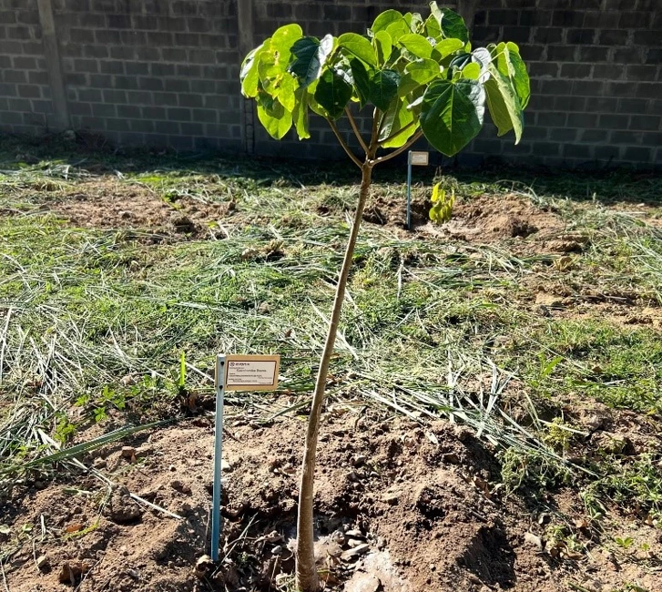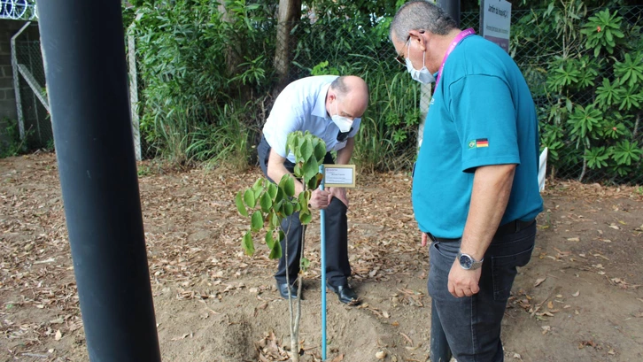 Todos os exemplares das espécies florestais do jardim possuem placa de identificação contendo a nomenclatura botânica, o nome popular e o nome do colaborador Evonik que o adotou.
